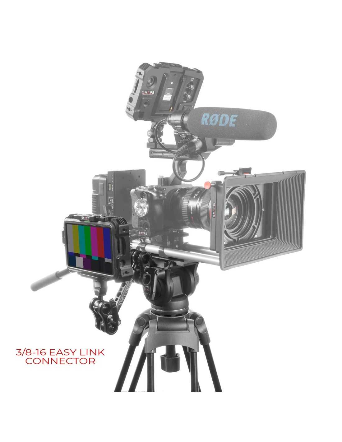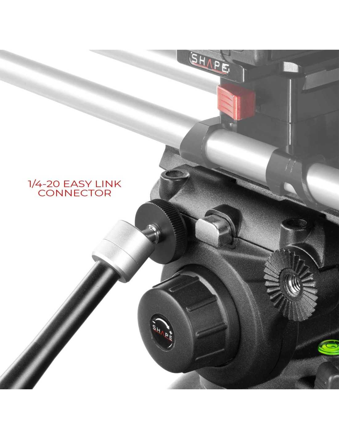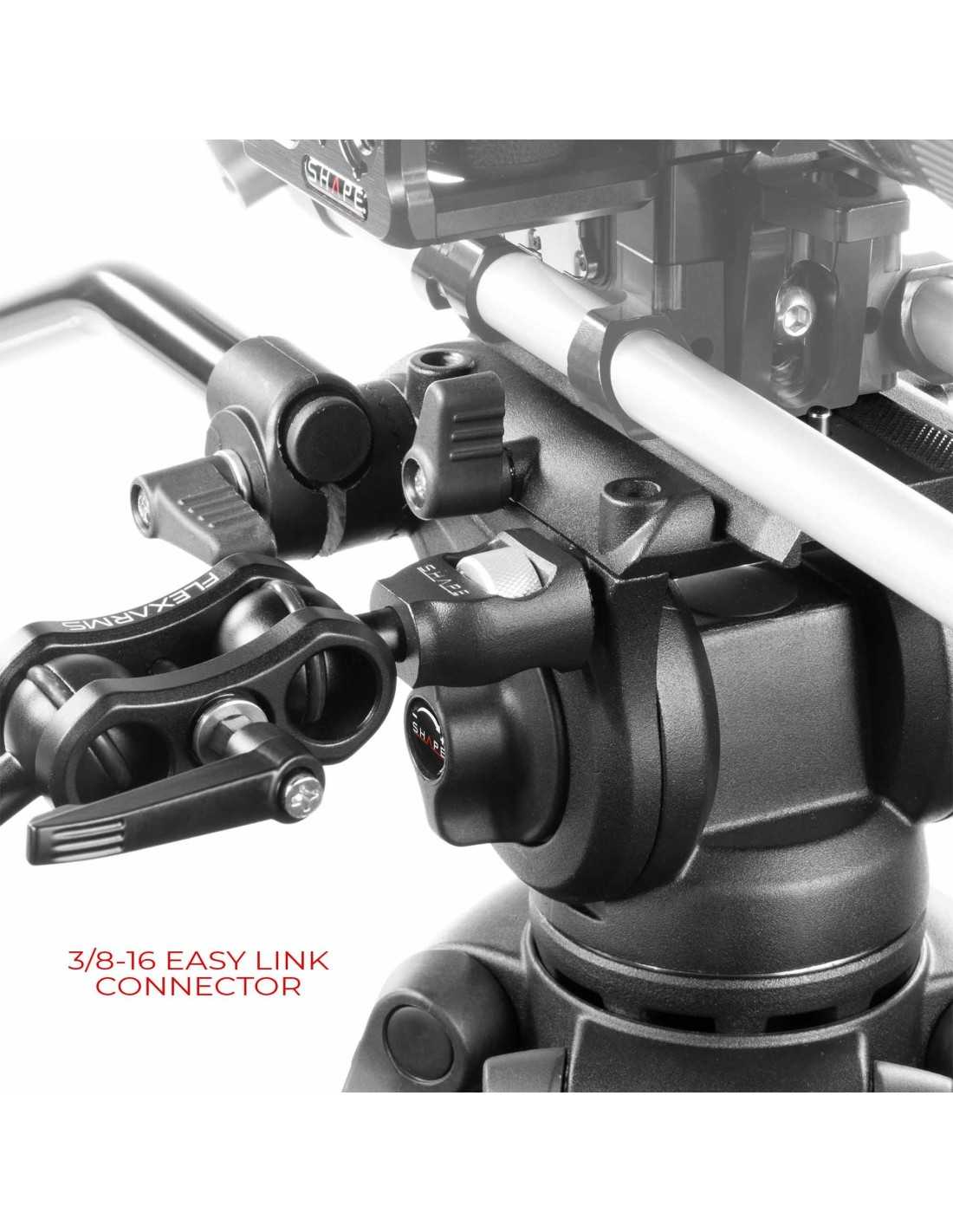 The camera platform provides support to DSLR ,Mirrorless and small Camcorder cameras as well as fully rigged cages with matte boxes and batteries. The 75mm half ball head allows you to quickly level the head without having to readjust the legs. It also makes it easier to create dutch angle shots without unbalancing the tripod. The head includes a 500PLONG sliding quick release plate which has both a ¼-20 & 3/8-16 camera screws. One pan handle is also included with the head. It can be installed on one of the two mounting rosettes, one on each side of the head for left or right-handed operation. Two Easy Link connectors (1/4-20 & 3/8-16), one on each side of the head are threaded holes which allow you to mount accessories to the head, and not the camera.