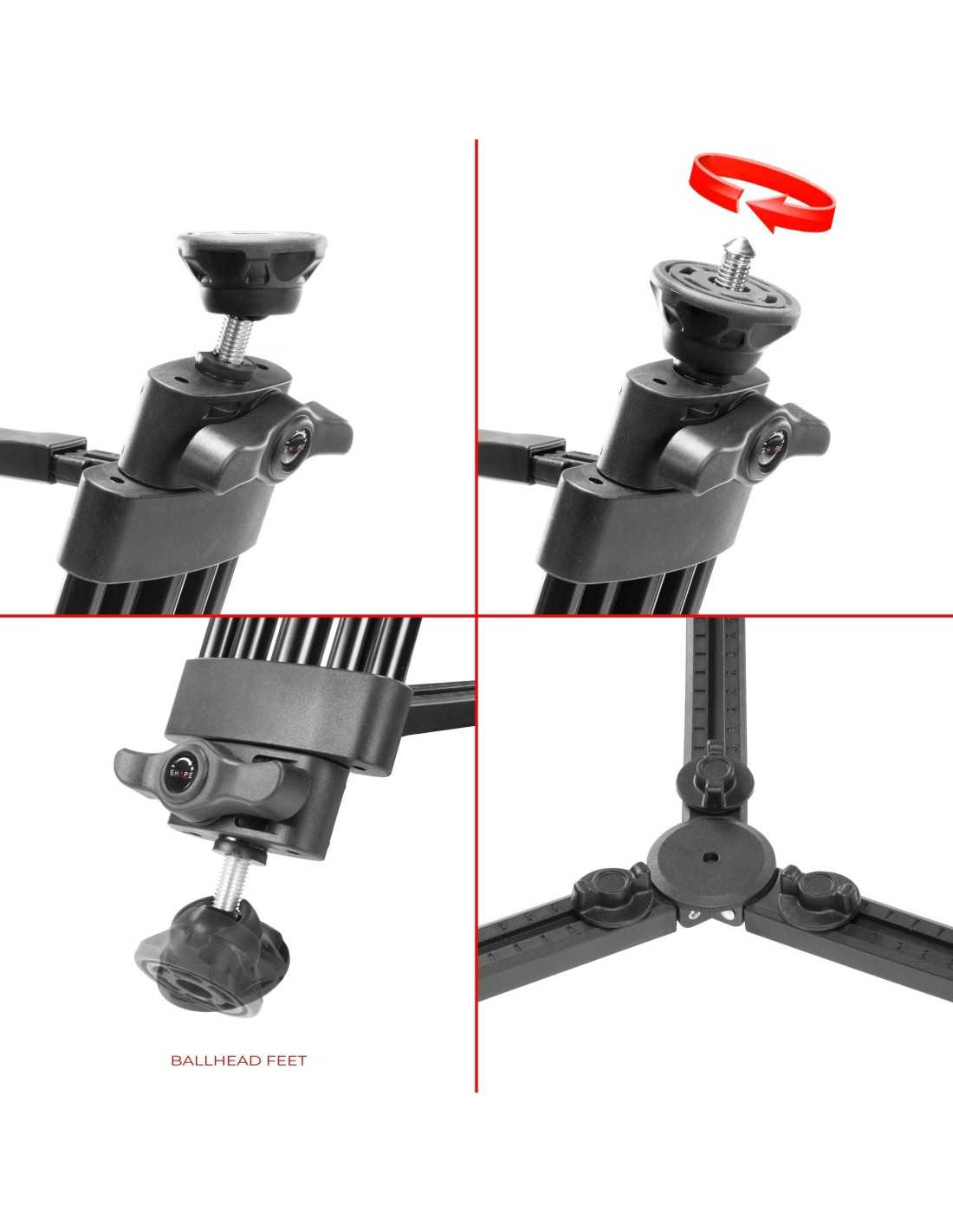 Featuring a 75mm bowl and made of aluminum alloy, each leg can be independently raised and lowered when required. The mid-level spreader helps prevent instability that a ground-level spreader can introduce when working on uneven surfaces. Non-removable rubber feet provide secure grip and are directly mounted on aluminum threaded spikes, useful for uneven terrain or icy surface